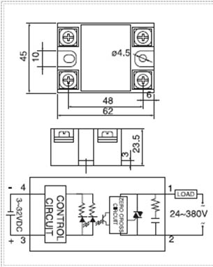 四. 單相固態(tài)繼電器安裝接線圖:(單位:mm)