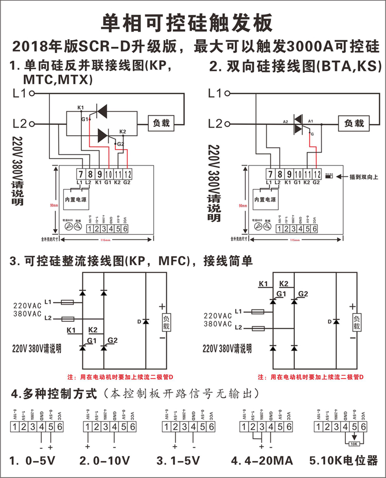只要個(gè)信號(hào):(多種控制信號(hào)輸入:DC 4-20mA、DC 1-5V、DC 0-10V、10k電位器),就能給出線性輸出,任意調(diào)溫調(diào)速調(diào)壓??芍苯佑|發(fā)2000A以下的二只單向晶閘管。本控制板由高性能單片機(jī)作為控制、運(yùn)算放大器、脈沖變壓器等單元組成??梢耘c各種自動(dòng)化儀表配套使用,對(duì)儀表無干擾,也可以外接電位器手動(dòng)控制,廣泛應(yīng)用于負(fù)載要求連續(xù)平滑調(diào)節(jié),擰制精度較高或不允許大電流沖擊的控制系統(tǒng)。如交直流電機(jī)調(diào)速、調(diào)壓、充電等。主要用于單相純阻性負(fù)載、單相感性負(fù)載或變壓器原邊控制,如硅碳棒、硅鉬棒、電阻絲等,也可用于單相或兩相全橋半控整流,具有觸發(fā)可靠,高精度,工作穩(wěn)定,使用靈活的優(yōu)點(diǎn)。